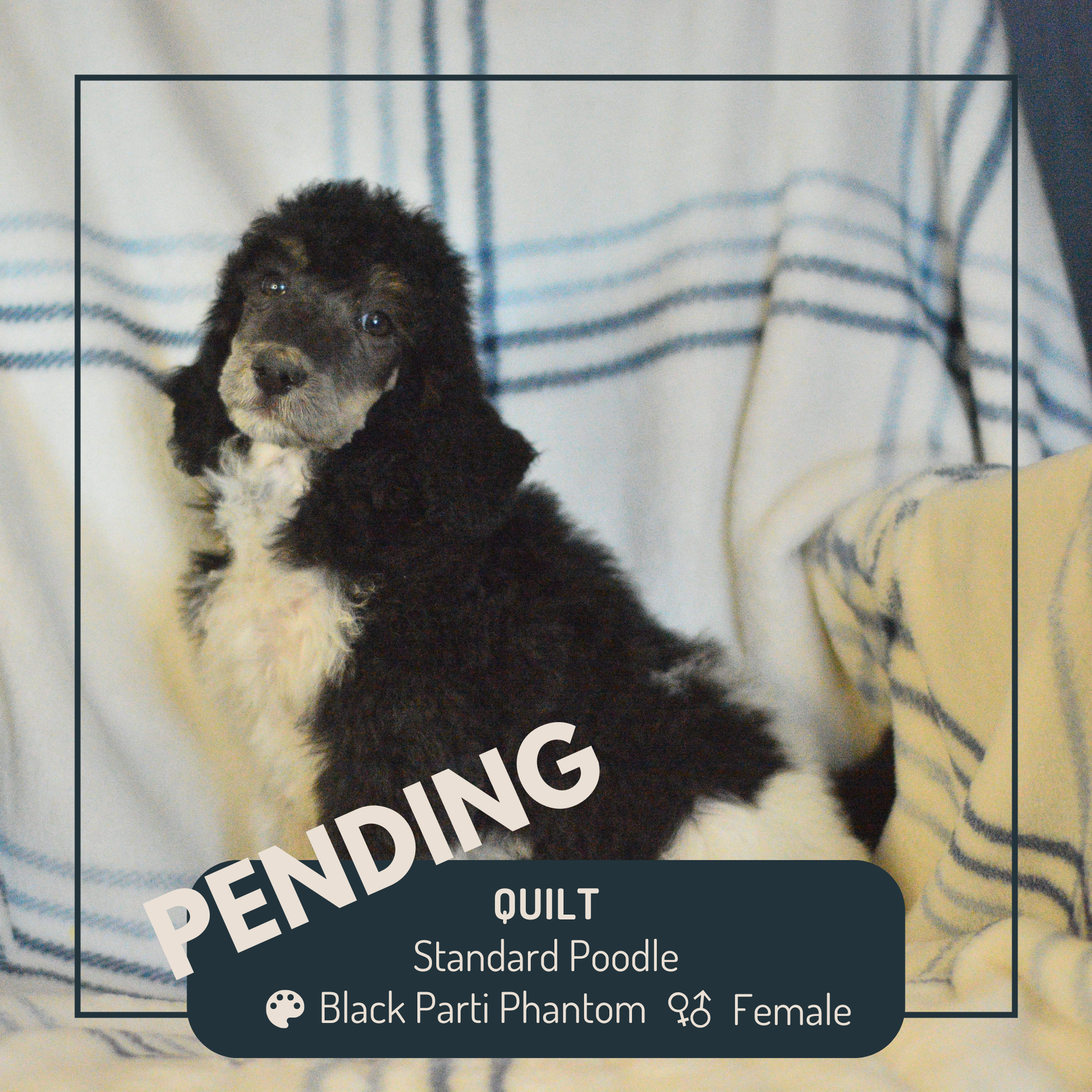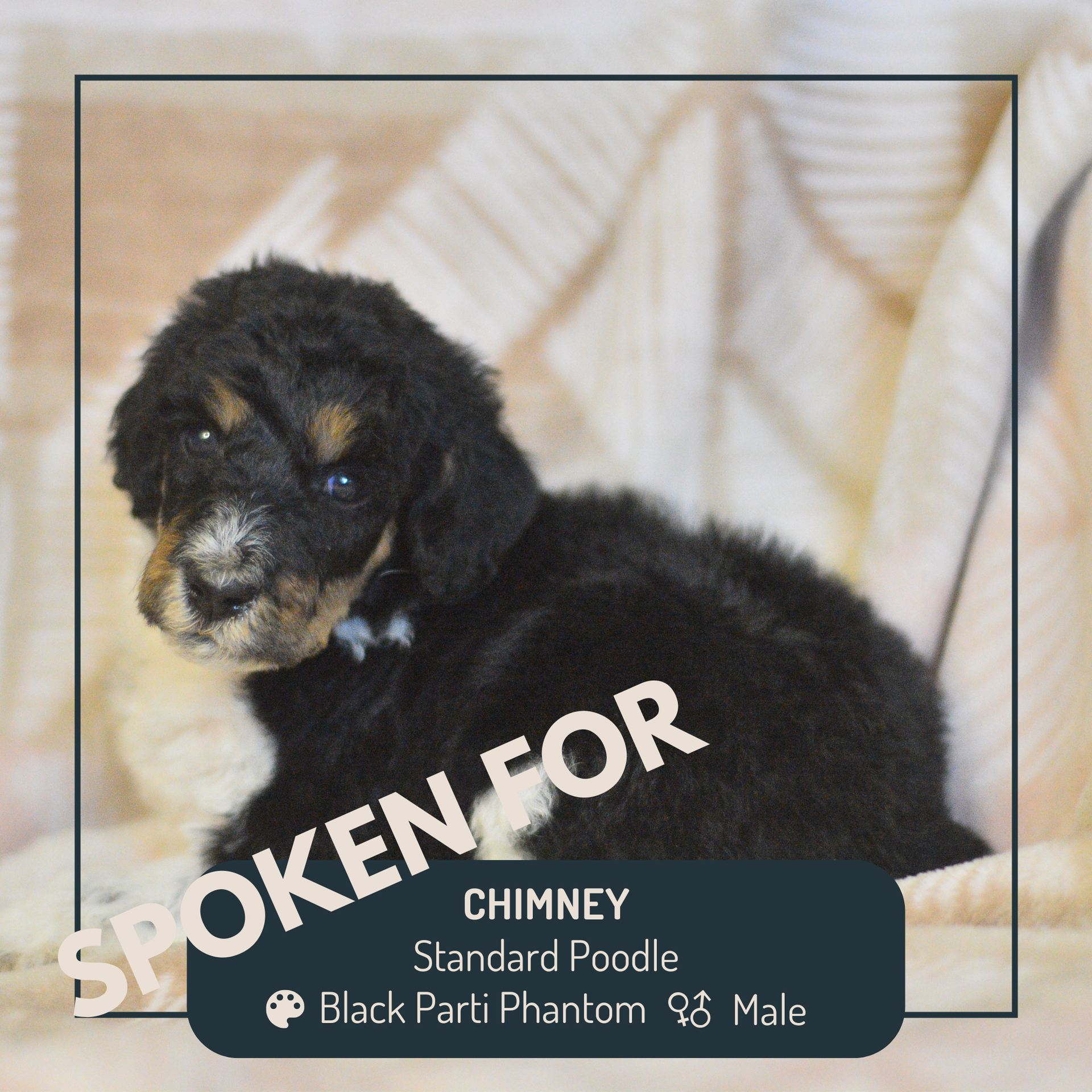 A phantom is a Poodle with tan points. Tan points are typically seen as eyebrows, brown/tan cheeks, under the tails, and since the parti pattern creates white legs, if there is “ticking” (a freckle look) the lower half of the leg and chest will express the tan points as well.