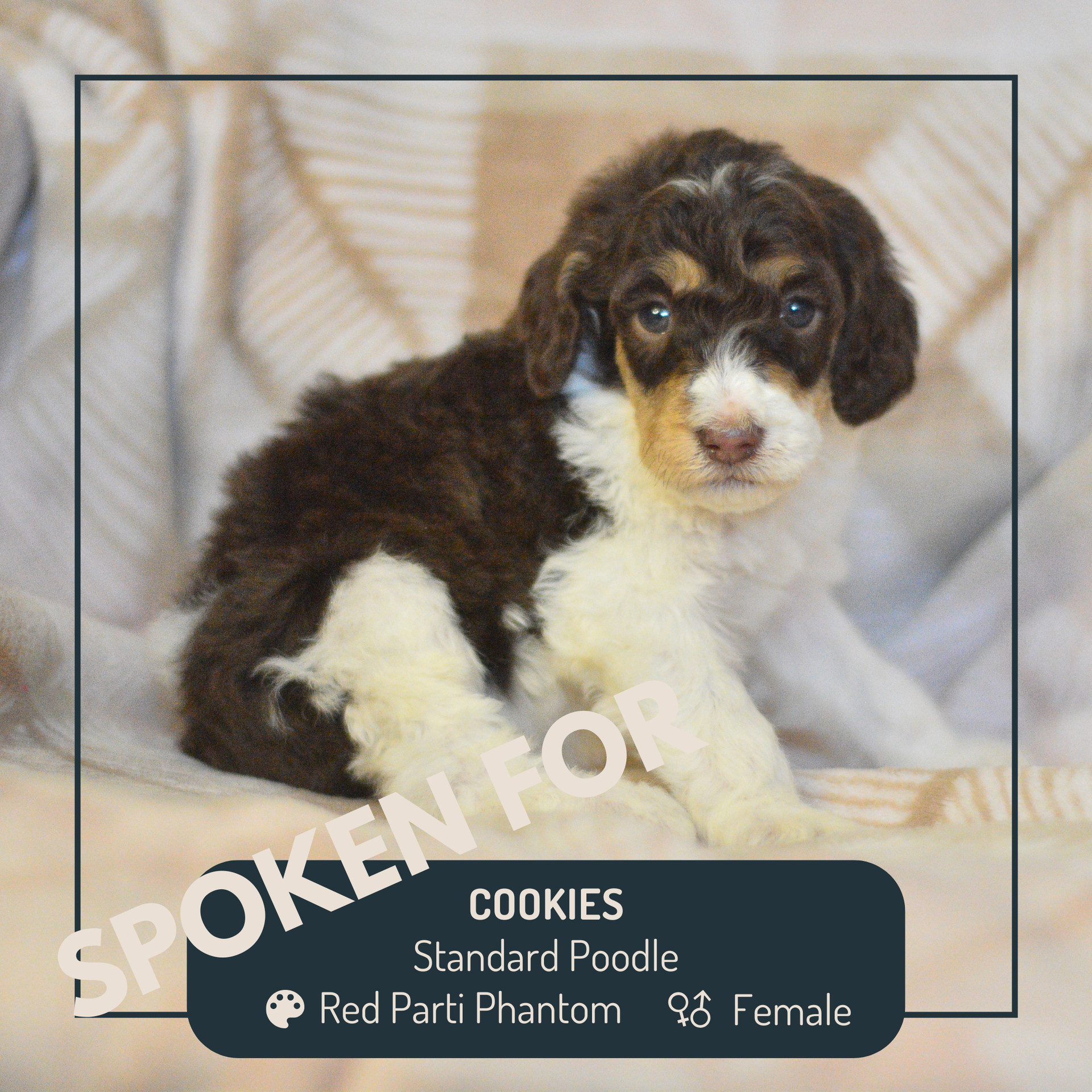 All our Poodles are genetically set to ONLY produce parti phantoms. This is so that when we keep one back, we know they will always produce a colorful Aussiedoodle with tan points and white markings.